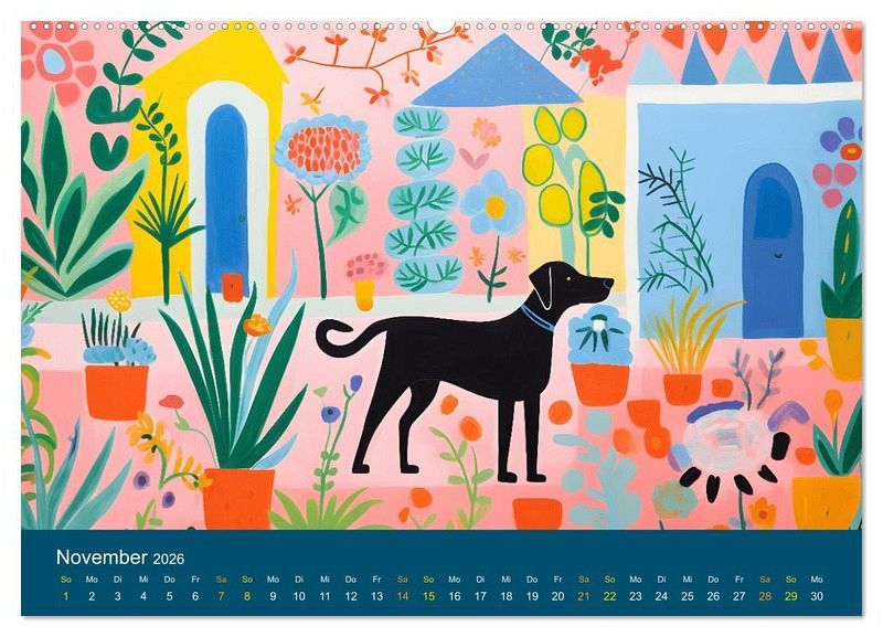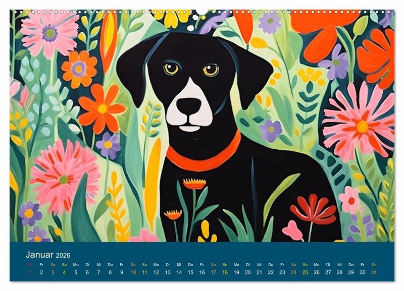 Januar: Schwarzer Hund im Blumenmeer
