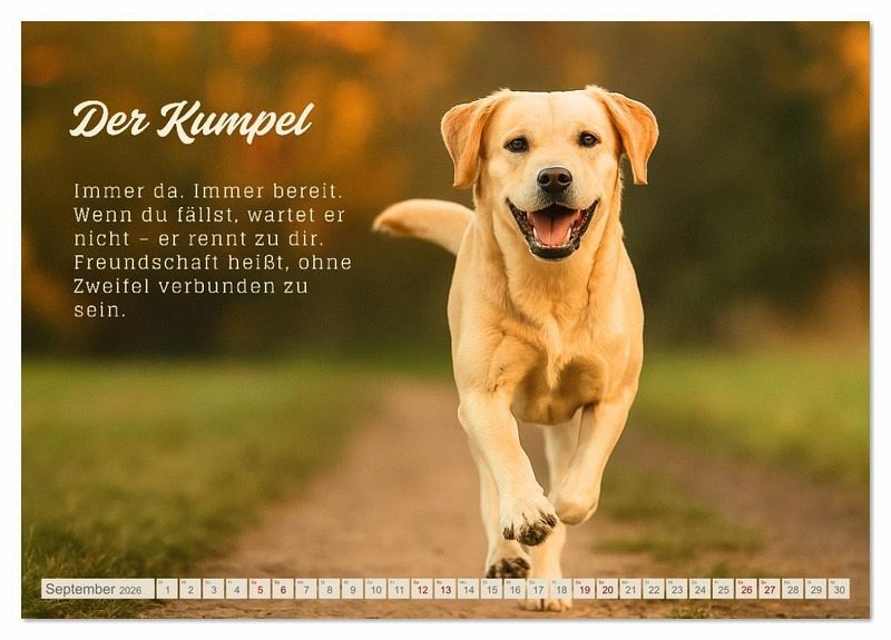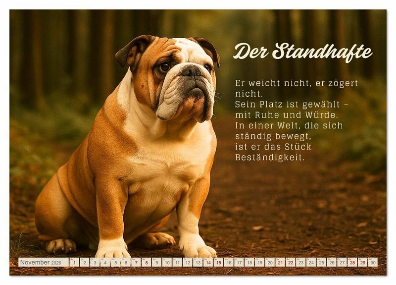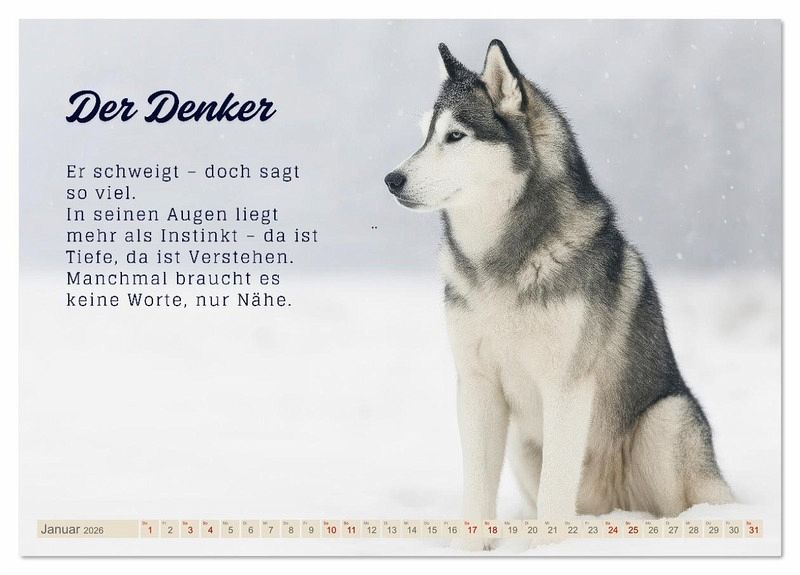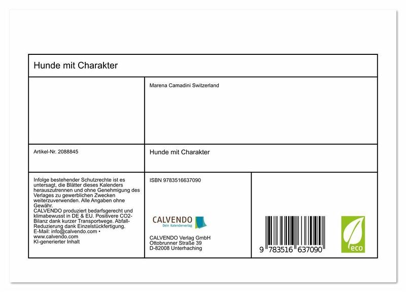 Hunde mit Charakter ist kein gewöhnlicher Kalender, es ist eine Hommage an unsere treuesten Gefährten. Jeder Monat zeigt einen besonderen Hund in seinem Element: stolz, verspielt, nachdenklich oder voller Lebensfreude. Mit großformatigen Bildern erzählt dieser Kalender stille Geschichten von Nähe, Vertrauen und Persönlichkeit. Jede Aufnahme lädt zum Verweilen ein. Ideal für Hundeliebhaber, die echte Momente und individuelle Ausstrahlung schätzen. Dieser Kalender bringt Herz in jeden Raum, Monat für Monat.