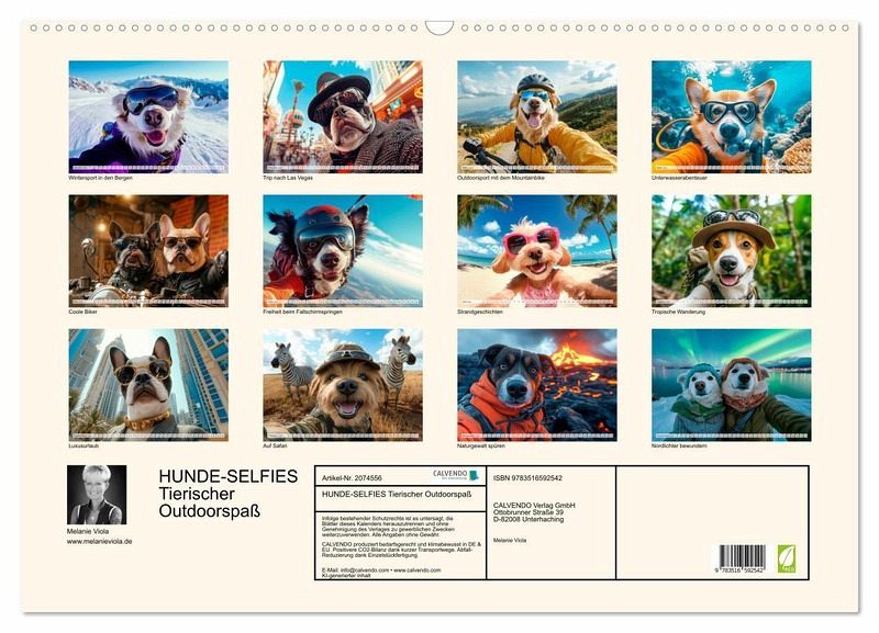 Bereit für ein Jahr voller tierischer Abenteuer? Entdecke Hunde voller Lebensfreude. Ob wild, verspielt oder einfach charmant, jeder Monat überrascht mit einem neuen Outdoor-Selfie, das dich zum Lächeln bringt. Faszinierende Kulissen und spannende Perspektiven machen diesen Kalender zum Highlight an jeder Wand. Für Hundefans und alle, die das Außergewöhnliche lieben. Die Szenen wurden liebevoll und fantasievoll mit künstlicher Intelligenz erschaffen.