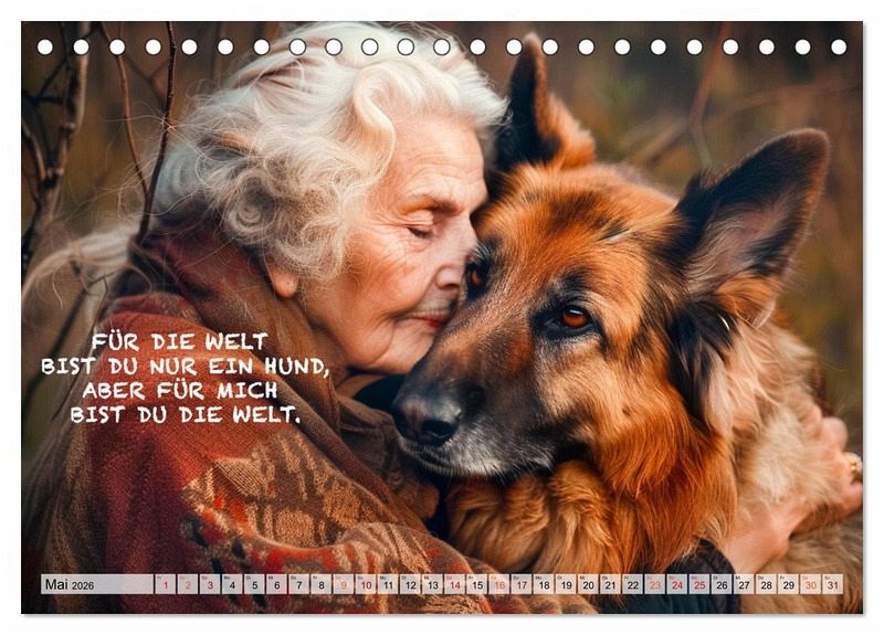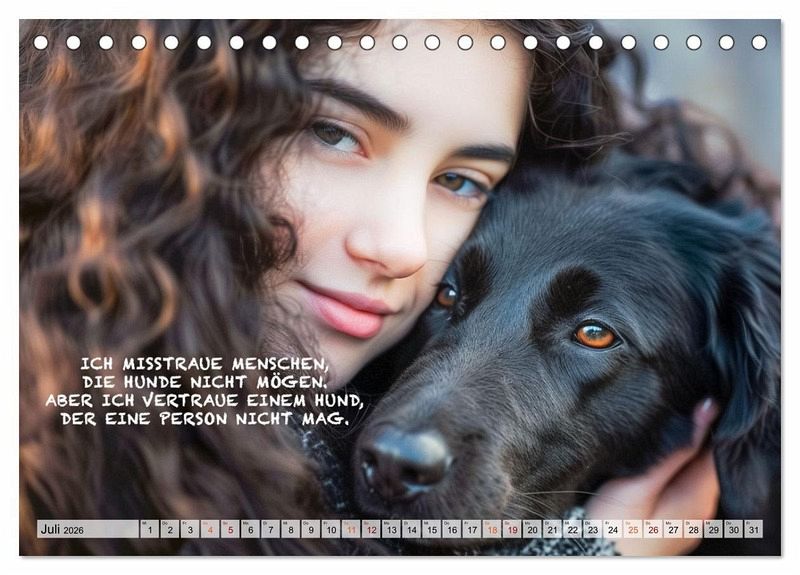 Jeder Monat bringt Ihnen nicht nur ein zauberhaftes Bild eines Hundes, sondern auch einen weisen und berührenden Sinnspruch über Hunde, der Sie zum Nachdenken anregt und Ihr Herz erwärmt. Begleiten Sie die besten Freunde des Menschen durch das Jahr und lassen sich täglich von ihrer Loyalität, Liebe und Lebensfreude inspirieren. Machen Sie jeden Tag zu einem besonderen Tag, mit der Magie der Hunde an Ihrer Seite.