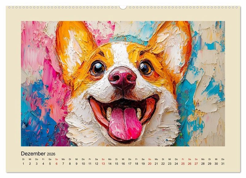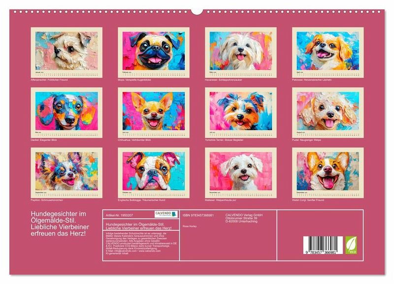 Dieser entzückende Kalender fängt die lieblichen und treuen Blicke unserer besten Freunde in wunderschönen Ölgemälde-Portraits ein. Jeder Monat wurde mit Hilfe von KI erstellt und präsentiert ein anderes, hinreißendes Hundegesicht, um das Herz zu erwärmen. Die Bilder vereinen klassischen Gemälde-Stil mit der unvergänglichen Niedlichkeit der Hunde. Perfekt für Hundeliebhaber und Kunstfreunde gleichermaßen.