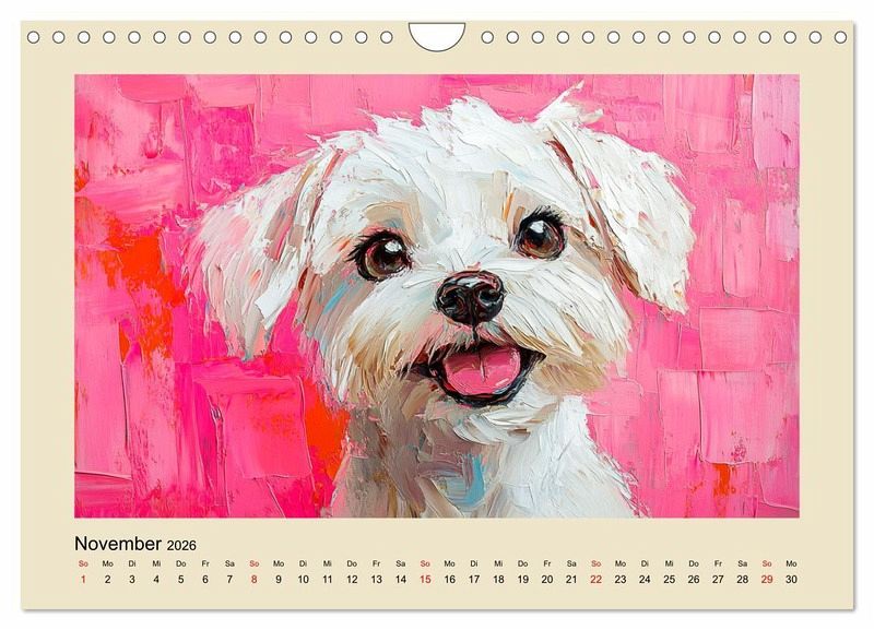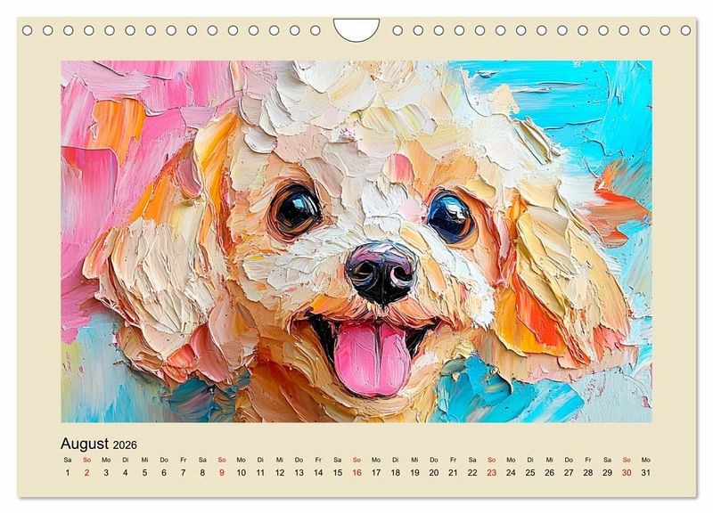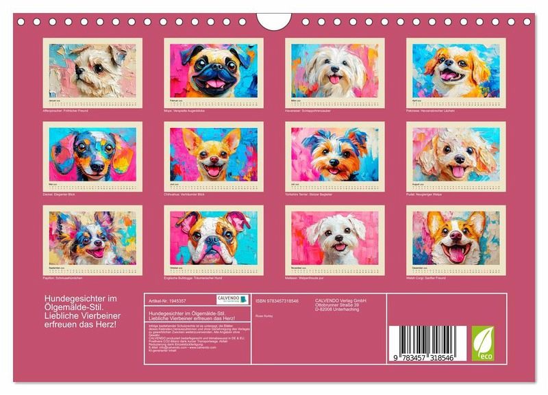 Dieser entzückende Kalender fängt die lieblichen und treuen Blicke unserer besten Freunde in wunderschönen Ölgemälde-Portraits ein. Jeder Monat wurde mit Hilfe von KI erstellt und präsentiert ein anderes, hinreißendes Hundegesicht, um das Herz zu erwärmen. Die Bilder vereinen klassischen Gemälde-Stil mit der unvergänglichen Niedlichkeit der Hunde. Perfekt für Hundeliebhaber und Kunstfreunde gleichermaßen.