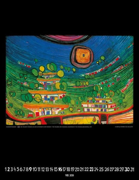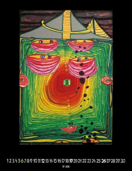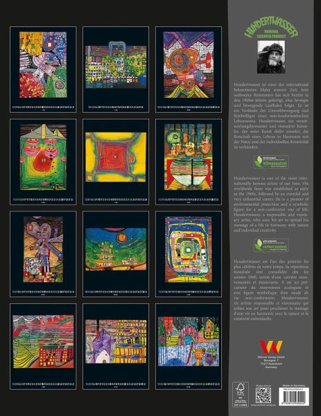 Der Hundertwasser Art Calendar 2026 im Format 44 x 34 cm besticht durch 13 Bilder des Künstlers Friedensreich Hundertwasser. Das glanzfoliengeprägte Titelblatt, die hervorragende Druckqualität, sowie der elegant Mattschwarz gedruckte Fond, sind allesamt Qualitätsmerkmale dieses hochwertigen Hundertwasser Kalenders. Um der umweltfreundlichen Philosophie Hundertwassers zu entsprechen, wird dieser Kalender klimaneutral auf FSC-Papier aus nachhaltiger Forstwirtschaft gedruckt. Zudem ist dieser Kalender vollständig im qualitätsbewussten Deutschland hergestellt.