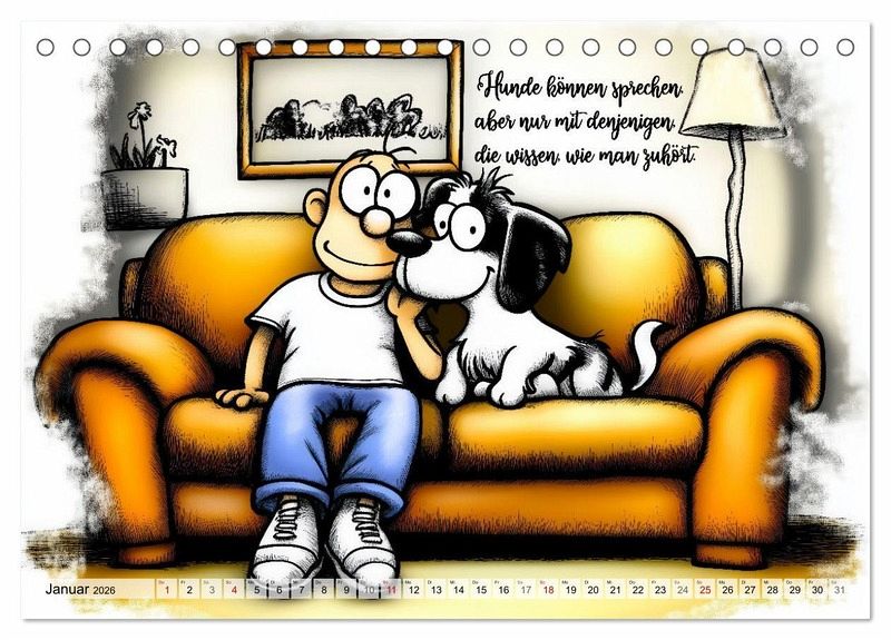 Dieser Kalender kombiniert lustige Hundesprüche mit einzigartigen KI-generierten Bildern, die perfekt zum Humor der Vierbeiner passen. Ein absoluter Hingucker für Hundeliebhaber und alle, die Freude und Witz in ihrem Alltag schätzen. Hol dir deinen Kalender und bring Farbe und Spaß in dein Jahr!