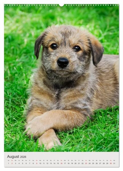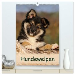 Niedliche Welpenbilder verschiedener Hunderassen (Islandhund, Wachtelhund, Berger Picard, Golden Retriever, Dalmatiner, Akita, Labrador, Australian Shepherd) begleiten den Hundefreund durch das ganze Jahr