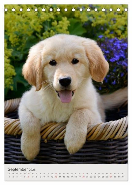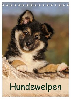Niedliche Welpenbilder verschiedener Hunderassen (Islandhund, Wachtelhund, Berger Picard, Golden Retriever, Dalmatiner, Akita, Labrador, Australian Shepherd) begleiten den Hundefreund durch das ganze Jahr
