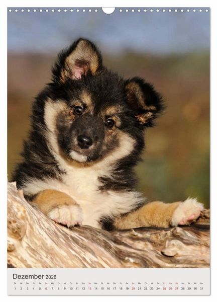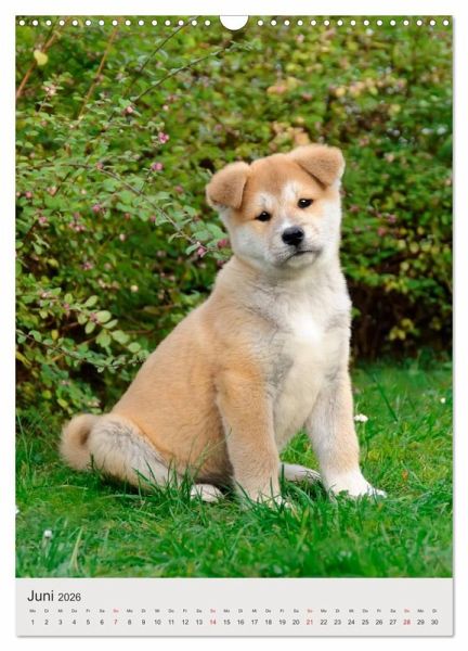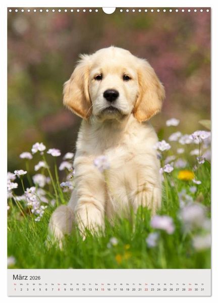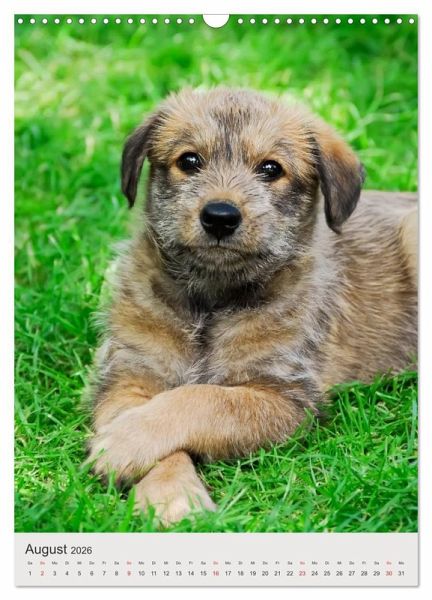 Niedliche Welpenbilder verschiedener Hunderassen (Islandhund, Wachtelhund, Berger Picard, Golden Retriever, Dalmatiner, Akita, Labrador, Australian Shepherd) begleiten den Hundefreund durch das ganze Jahr
