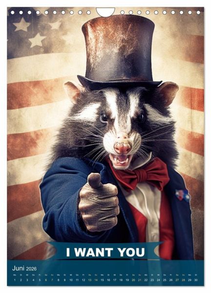Tauchen Sie ein in die Welt von "I want you im tierischen Design" - dem Jahreskalender, der die ikonische Uncle Sam Pose auf eine Weise neu interpretiert, die Sie garantiert zum Schmunzeln bringt. Mit zwölf mit KI generierten humorvollen und kunstvoll gestalteten Seiten präsentieren wir Ihnen eine einzigartige Sammlung von Tieren, die in die Rolle des berühmten amerikanischen Symbols schlüpfen. Von der majestätischen Pose eines Adlers bis hin zum verschmitzten Grinsen eines Waschbären - jeder Monat überrascht mit einem neuen, liebevoll gestalteten Bild, das die Brücke zwischen Tierreich und amerikanischer Geschichte schlägt. Dieser Kalender ist nicht nur ein Blickfang für Ihre Wand, sondern auch das perfekte Geschenk für alle, die eine besondere Verbindung zu Amerika haben.