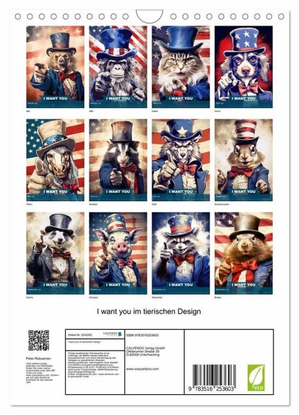 Tauchen Sie ein in die Welt von "I want you im tierischen Design" - dem Jahreskalender, der die ikonische Uncle Sam Pose auf eine Weise neu interpretiert, die Sie garantiert zum Schmunzeln bringt. Mit zwölf mit KI generierten humorvollen und kunstvoll gestalteten Seiten präsentieren wir Ihnen eine einzigartige Sammlung von Tieren, die in die Rolle des berühmten amerikanischen Symbols schlüpfen. Von der majestätischen Pose eines Adlers bis hin zum verschmitzten Grinsen eines Waschbären - jeder Monat überrascht mit einem neuen, liebevoll gestalteten Bild, das die Brücke zwischen Tierreich und…mehr