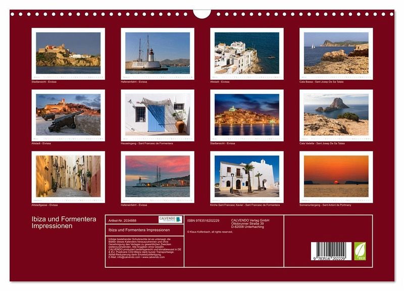 Malerische Buchten, weite Strände, weiße Dörfer und eine romantische Altstadt. Dieser Kalender beinhaltet 12 Fotografien, die in den letzten Jahren auf Ibiza oder Formentera entstanden sind. Fotografiert wurde an den Orten Eivissa (Altstadt), Sant Antoni de Portmany, Playa de Figueretas und Sant Francesc de Formentera.