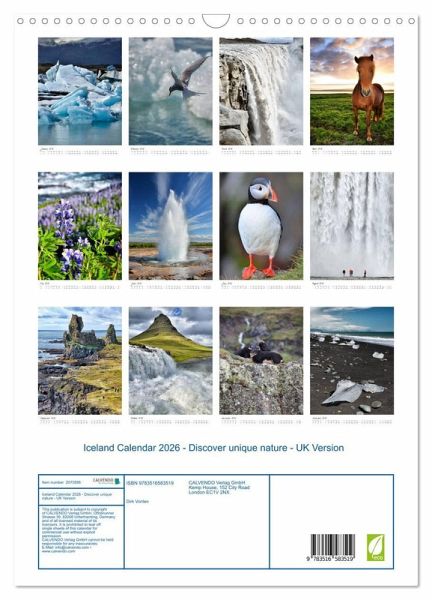 QUALITY - High-quality photo calendar with 12 beautiful images on light-resistant paper, robust spiral binding with hanger.SUSTAINABLE - Significant waste reduction due to print-on-demand production, environmentally friendly FSC-certified paper, produced in the UK, climate-conscious logistical processes.PERFECT GIFT - calendars for friends and family, for children, all ages and all occasions, from Christmas to birthdays and everything in between.LOTS OF CHOICE - Wall calendars in different sizes (DIN A4 and DIN A3), for any topic and personal taste, featuring photography, painting and illustrations.Iceland's nature is very unique and extra ordinary. The photos in this calendar show this variety by compiling the most stunning views on Iceland's nature., author: Dirk Vonten