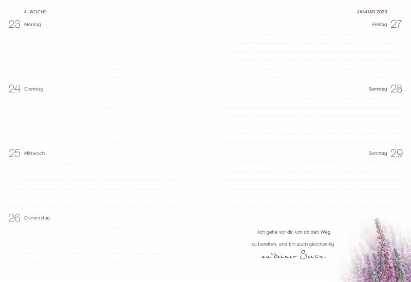 Das bewährte Kalender-Konzept "Meine Zeit" erfreut sich großer Beliebtheit. Neben einem ansprechenden und praktischen Äußeren mit runden Ecken, Lesebändchen und Gummiband zum Verschließen hat dieser vierfarbige Taschenkalender auch inhaltlich etwas zu bieten: Er enthält ein Wochenkalendarium, Jahresübersichten, zwei Andachten, ein Adressverzeichnis, Verleihlisten, Ferientermine, Raum für Notizen, Impulse und vieles mehr.Dieser Kalender enthält darüber hinaus ausgewählte Texte aus den Andachtsbüchern von Sarah Young.