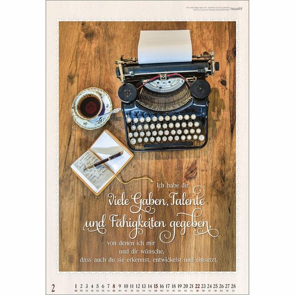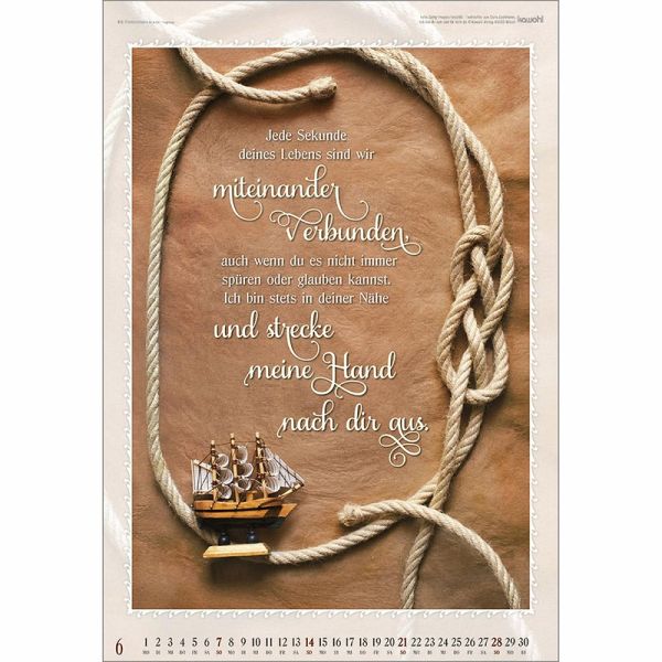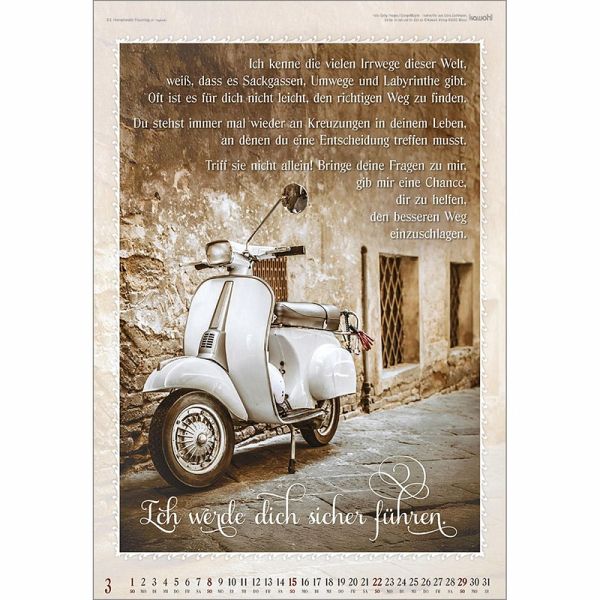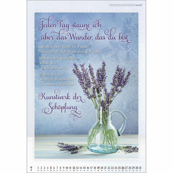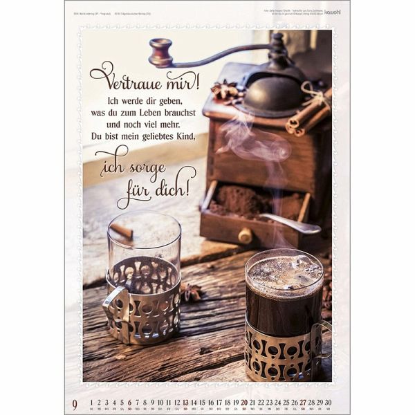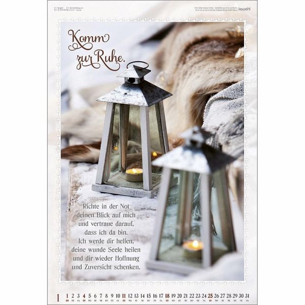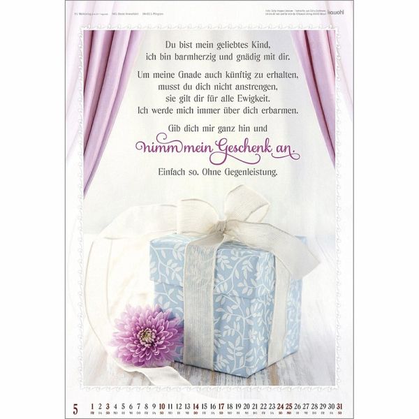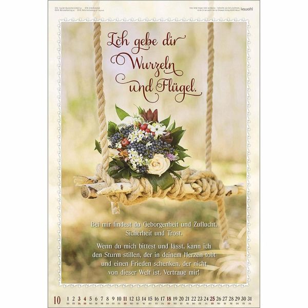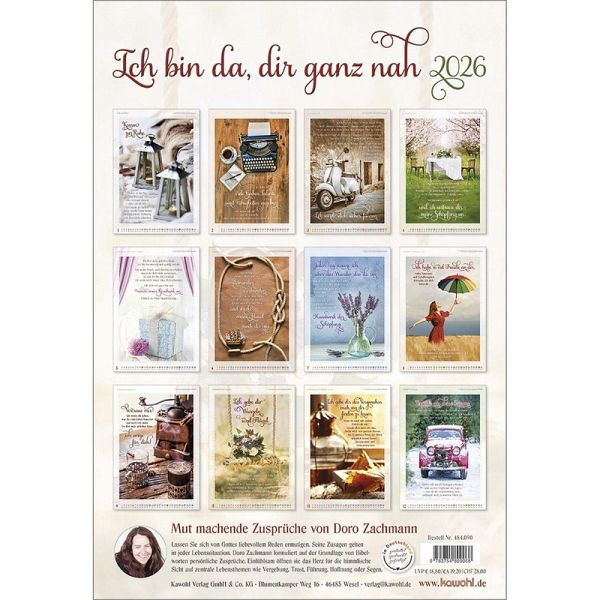 Wandkalender mit Gottes Zusagen für dein LebenEin wunderbarer Kalender im Vintage bzw. Shabby-Chic-LookLassen Sie sich von Gottes liebevollem Reden ermutigen.Seine Zusagen gelten in jeder Lebenssituation.Doro Zachmann formuliert auf der Grundlage von Bibelworten persönliche Zusprüche. Einfühlsam öffnen sie das Herz für die himmlische Sicht auf zentrale Lebensthemen wie Vergebung, Trost, Führung, Hoffnung oder Segen.Wand-Kalender:- trendige Bildsprache im Vintage bzw. Shabby-Chic-Look- mit Zusprüchen (an Bibelversen angelehnt) von Doro Zachmann- mit Kunstdruck-Papier