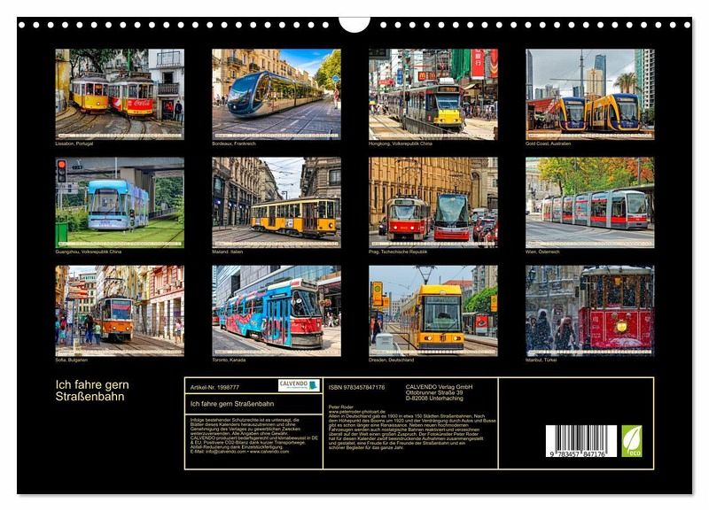 Allein in Deutschland gab es 1900 in etwa 150 Städten Straßenbahnen. Nach dem Höhepunkt des Booms um 1920 und der Verdrängung durch Autos und Busse gibt es schon länger eine Renaissance. Neben neuen hochmodernen Fahrzeugen werden auch nostalgische Bahnen reaktiviert und verzeichnen überall auf der Welt einen großen Zuspruch. Der Fotokünstler Peter Roder hat für diesen Kalender zwölf beeindruckende Aufnahmen zusammengestellt und gestaltet, eine Freude für die Freunde der Straßenbahn und ein schöner Begleiter für das ganze Jahr.