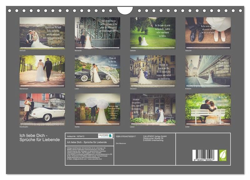 Sie wollen Ihrem Partner einmal sagen, was Er oder Sie Ihnen bedeutet. Dann ist dieser einmalige Wandkalender der Fotografen Dirk Meutzner genau das richtige für Sie. Nicht nur die zwölf wunderschönen und einzigartigen Bilder werden Sie beeindrucken, sondern auch die wunderschönen Sprüche und Liebesbekenntnisse.