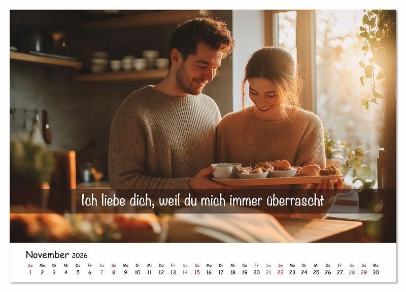 Dieser liebevoll gestaltete Kalender für Paare bringt jeden Monat neue Liebe der Zuneigung: Ich liebe dich, weil... Ein Liebeskalender perfektes Geschenk für Partner, Freundin, Freund oder Geschenk für die Ehefrau oder Ehemann - zu Weihnachten, Valentinstag, Jahrestag oder einfach zwischendurch. Mit zwölf persönlichen Liebeserklärungen schafft dieser KI-generierte Kalender für Partner Nähe, Wärme und emotionale Verbindung und lässt die Beziehung aufleben. Ob als Partnerkalender, Paarkalender oder persönliches Geschenk - er ist ideal für alle, die ihre Liebe feiern möchten. Für Menschen in Beziehungen, die Gefühle, Gemeinsamkeit und besondere Momente wertschätzen. Ein echtes Highlight unter den Geschenkideen für Partner und Partnerinnen.