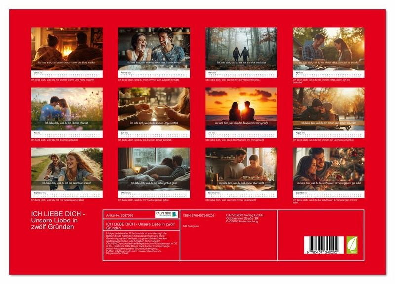 PREMIUM-LINIE - Brillanter Fotokalender mit 12 wunderschönen Motiven, Kunstdruck in Hochglanz in Museumsqualität.QUALITÄT - edle Materialien, stabile Rückwand mit 2 innovativen Einstecktaschen für eine optimale Präsentation an der Wand.NACHHALTIG - deutliche Abfallreduzierung durch bedarfsgerechte Einzelstückfertigung, umweltfreundliches FSC-zertifiziertes Papier, Produktion in Deutschland, klimabewusste Logistik.PERFEKTES GESCHENK - Kalender für Freunde und Familie, für Kinder und Erwachsene, jung und alt, zu Weihnachten, Geburtstag oder zwischendurch.Emotionaler Liebeskalender für Paare mit zwölf liebevollen ich Liebe dich Botschaften. Ideal zu Weihnachten als Geschenk für Partner, Freundin, Freund, Ehefrau oder Ehemann. von Autor(in): Michael Bihlmayer