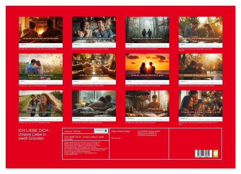 QUALITÄT - Hochwertiger Fotokalender mit 12 wunderschönen Motiven auf lichtbeständigem Bilderdruckpapier, robuste Spiralbindung mit Aufhängebügel.NACHHALTIG - deutliche Abfallreduzierung durch bedarfsgerechte Einzelstückfertigung, umweltfreundliches FSC-zertifiziertes Papier, Produktion in Deutschland, klimabewusste Logistik.PERFEKTES GESCHENK - Kalender für Freunde und Familie, für Kinder und Erwachsene, jung und alt, zu Weihnachten, Geburtstag oder zwischendurch.VIELFALT - Bildkalender in verschiedenen Formaten, z.B. DIN A5, DIN A4, DIN A3 sowie DIN A2. Ob Naturmotiv, Gemälde oder Fotos, ideal für ein persönliches Wohlfühlambiente.Emotionaler Liebeskalender für Paare mit zwölf liebevollen ich Liebe dich Botschaften. Ideal zu Weihnachten als Geschenk für Partner, Freundin, Freund, Ehefrau oder Ehemann. von Autor(in): Michael Bihlmayer