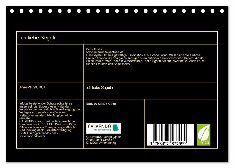 Das Segeln übt eine gewaltige Faszination aus. Sonne, Wind, Wellen und die endlose Freiheit können Sie das ganze Jahr genießen mit diesen wunderschönen Bildern, die der Fotokünstler Peter Roder in Wasserfarben-Technik gestaltet hat. Zwölf mitreißende Fotos für alle Freunde des Segelsports.