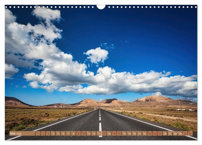 Mai: Endlose Straße führt durch Lavalandschaft zum Horizont