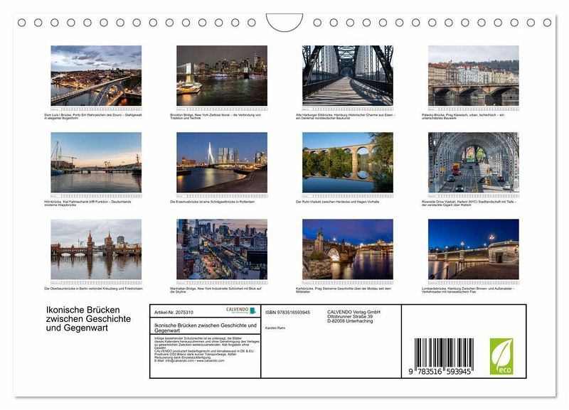 Brücken sind weit mehr als nur Verbindungen zwischen zwei Ufern: Sie sind Meisterwerke der Ingenieurskunst, kulturelle Wahrzeichen und stille Zeugen ihrer Zeit. Dieser Kalender nimmt Sie mit auf eine fotografische Reise zu zehn beeindruckenden Brücken weltweit. Sie sehen unter anderem die majestätische Dom-Luís-I.-Brücke in Porto, die historische Karlsbrücke in Prag, die ikonischen Brücken New Yorks und technische Meisterleistungen wie die Hörnbrücke in Kiel. Jedes Bild fängt die einzigartige Atmosphäre und Baukunst der jeweiligen Brücke ein. Der Kalender ist ein Muss für Liebhaber von Architektur, Reisen und urbaner Ästhetik.