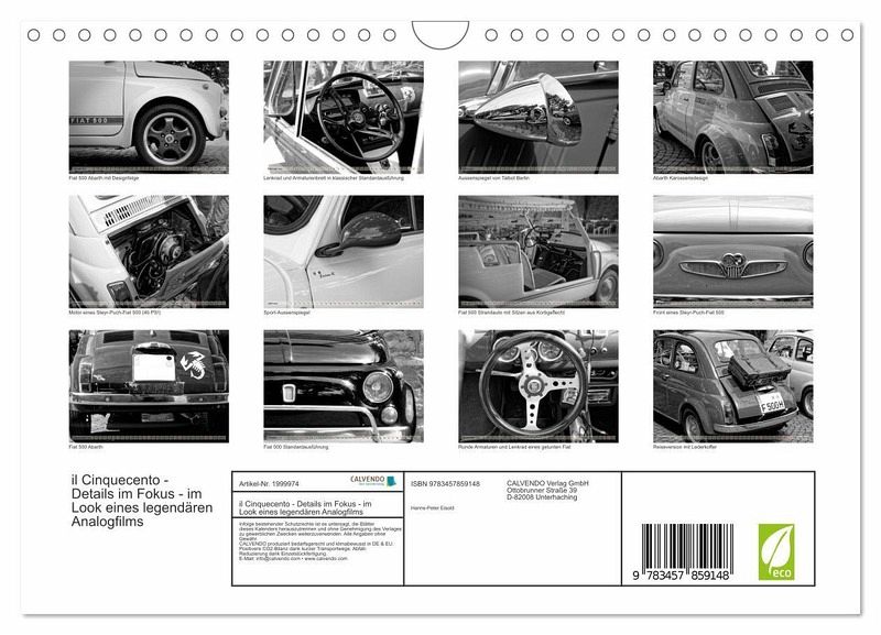 QUALITÄT - Hochwertiger Fotokalender mit 12 wunderschönen Motiven auf lichtbeständigem Bilderdruckpapier, robuste Spiralbindung mit Aufhängebügel.NACHHALTIG - deutliche Abfallreduzierung durch bedarfsgerechteEinzelstückfertigung, umweltfreundliches FSC-zertifiziertes Papier, Produktion in Deutschland, klimabewusste Logistik.PERFEKTES GESCHENK - Kalender für Freunde und Familie, für Kinder und Erwachsene, jung und alt, zu Weihnachten, Geburtstag oder zwischendurch.VIELFALT - Bildkalender in verschiedenen Formaten, z.B. DIN A5, DIN A4, DIN A3 sowie DIN A2. Ob Naturmotiv, Gemälde oder Fotos, ideal für ein persönliches Wohlfühlambiente.Details vom Fiat 500 - entwickelt mit Kodak Tri-X 400 von Autor(in): Hanns-Peter Eisold