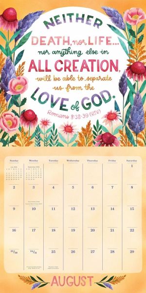 * COMFORT AND WISDOM: Each month features an inspiring Bible verse (from both the Old and New Testaments) to encourage faith, devotion, and hope. * INSPIRING ART: Becca Cahan’s bold color illustration and exquisite hand-lettering enhance the power of the words on the page and bring peace to the spirit. * GORGEOUS GIFT: A beautiful gift for anyone looking to include more Bible wisdom in their life. * NOW PLASTIC-FREE!: Workman wall calendars are completely plastic-free! Now printed with an extended paper flap closed with a fully recyclable seal—no more shrink-wrap!