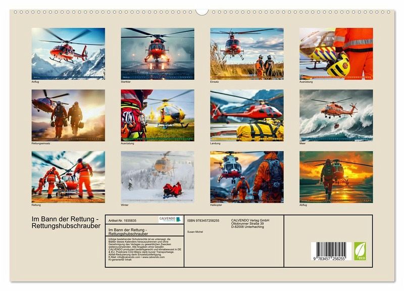 Dieser einzigartige Kalender bringt die Faszination der Luftrettung direkt an Ihre Wand. Zwölf beeindruckende Motive zeigen Rettungshubschrauber in spektakulären Einsätzen, umgeben von atemberaubenden Landschaften, spannenden Szenen und dem unermüdlichen Einsatz der Crews. Ob in schwindelerregenden Höhen, bei Nachtflügen oder bei lebensrettenden Einsätzen - jeder Monat erzählt eine neue Geschichte von Mut, Präzision und Menschlichkeit. Ein Muss für Fans der Luftrettung, Technikbegeisterte und alle, die den Einsatz dieser fliegenden Lebensretter bewundern!"Im Bann der Rettung - Rettungshubschrauber": Mehr als ein Kalender - eine Hommage an echte Helden.