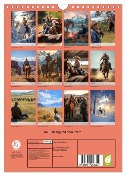 Dieser Kalender zeigt die wahre Kunst des Westernreitens, eingefangen in beeindruckenden, KI-generierten Bildern. Jeder Monat vermittelt das tiefe Verständnis und die Verbindung zwischen Reiter und Pferd - das harmonische Zusammenspiel von Mensch und Tier im Einklang mit der Natur. Durch moderne KI-Technologie entstehen detailreiche Szenen des Horsemanships, die die Schönheit und den Stolz des Westernreitens zum Leben erwecken. Ein Kalender, der sowohl die Technik als auch die Leidenschaft des Reitens feiert.