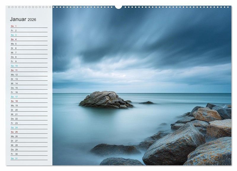 Tauche ein in die Stille. Dieser Fine-Art-Kalender fängt die Magie maritimer Langzeitbelichtungen ein. Glattes Wasser, sanft ziehende Wolken, minimalistische Kompositionen. Jedes Bild ist ein Innehalten, ein Atemzug zwischen Bewegung und Zeit. Ein Jahr voller Leichtigkeit, Weite und meditativer Ruhe. Ein stiller Begleiter für alle, die Schönheit im Einfachen suchen. Alle hier gezeigten Bilder wurden mit Sorgfalt, Liebe und mit Hilfe einer KI generiert. Abschließend werden sie mit Bildbearbeitungsprogrammen überarbeitet und in den Kalender eingefügt.