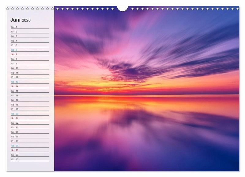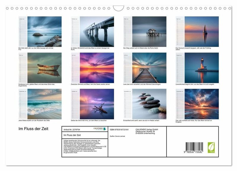 Tauche ein in die Stille. Dieser Fine-Art-Kalender fängt die Magie maritimer Langzeitbelichtungen ein. Glattes Wasser, sanft ziehende Wolken, minimalistische Kompositionen. Jedes Bild ist ein Innehalten, ein Atemzug zwischen Bewegung und Zeit. Ein Jahr voller Leichtigkeit, Weite und meditativer Ruhe. Ein stiller Begleiter für alle, die Schönheit im Einfachen suchen. Alle hier gezeigten Bilder wurden mit Sorgfalt, Liebe und mit Hilfe einer KI generiert. Abschließend werden sie mit Bildbearbeitungsprogrammen überarbeitet und in den Kalender eingefügt.