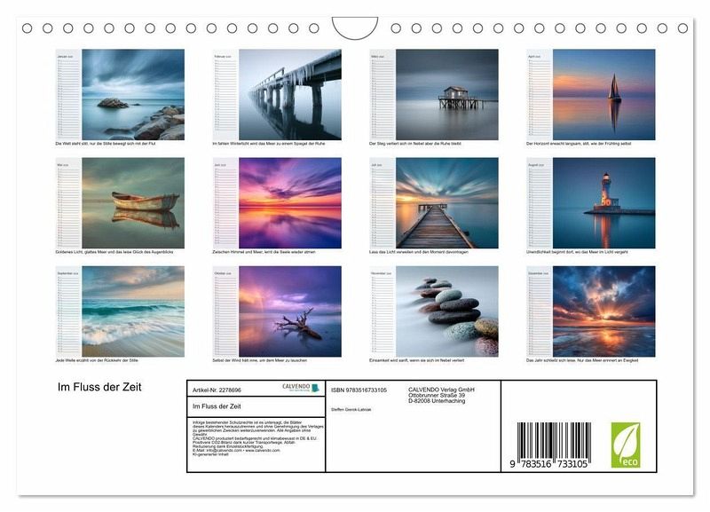 Tauche ein in die Stille. Dieser Fine-Art-Kalender fängt die Magie maritimer Langzeitbelichtungen ein. Glattes Wasser, sanft ziehende Wolken, minimalistische Kompositionen. Jedes Bild ist ein Innehalten, ein Atemzug zwischen Bewegung und Zeit. Ein Jahr voller Leichtigkeit, Weite und meditativer Ruhe. Ein stiller Begleiter für alle, die Schönheit im Einfachen suchen. Alle hier gezeigten Bilder wurden mit Sorgfalt, Liebe und mit Hilfe einer KI generiert. Abschließend werden sie mit Bildbearbeitungsprogrammen überarbeitet und in den Kalender eingefügt.