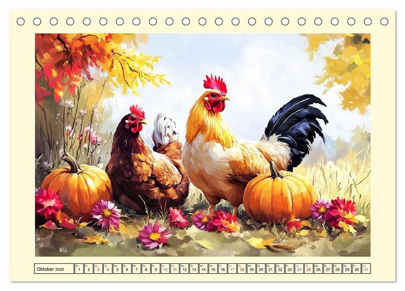 Dieser Kalender präsentiert zwölf poetische Illustrationen, die schönes Federvieh zeigen. Jede Szene ist in warmen, malerischen Farben gehalten und verbindet ländliche Ruhe mit floraler Schönheit. Die Bilder wurden mit Hilfe von KI erstellt und erinnern an klassische Ölgemälde. Sie versprühen eine nostalgische, beinahe meditative Stimmung und die hübschen Hühner stehen dabei als Symbol für Natur, Alltag und stille Anmut.