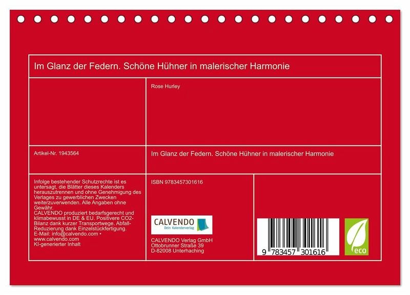QUALITÄT - Hochwertiger Fotokalender mit 12 wunderschönen Motiven auf lichtbeständigem Bilderdruckpapier, robuste Spiralbindung.NACHHALTIG - deutliche Abfallreduzierung durch bedarfsgerechte Einzelstückfertigung, umweltfreundliches FSC-zertifiziertes Papier, Produktion in Deutschland, klimabewusste Logistik.PERFEKTES GESCHENK - Kalender für Freunde und Familie, für Kinder und Erwachsene, jung und alt, zu Weihnachten, Geburtstag oder zwischendurch.VIELFALT - Bildkalender in verschiedenen Formaten, z.B. DIN A5, DIN A4, DIN A3 sowie DIN A2. Ob Naturmotiv, Gemälde oder Fotos, ideal für ein persönliches Wohlfühlambiente.Stimmungsvolle Bilder von Hühnern und Hähnen - inmitten von Blumen, Schnee und Natur - im zeitlosen Stil der klassischen Ölmalerei von Autor(in): Rose Hurley