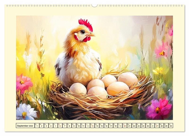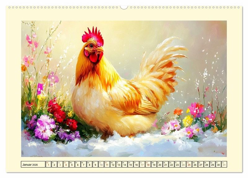 Dieser Kalender präsentiert zwölf poetische Illustrationen, die schönes Federvieh zeigen. Jede Szene ist in warmen, malerischen Farben gehalten und verbindet ländliche Ruhe mit floraler Schönheit. Die Bilder wurden mit Hilfe von KI erstellt und erinnern an klassische Ölgemälde. Sie versprühen eine nostalgische, beinahe meditative Stimmung und die hübschen Hühner stehen dabei als Symbol für Natur, Alltag und stille Anmut.
