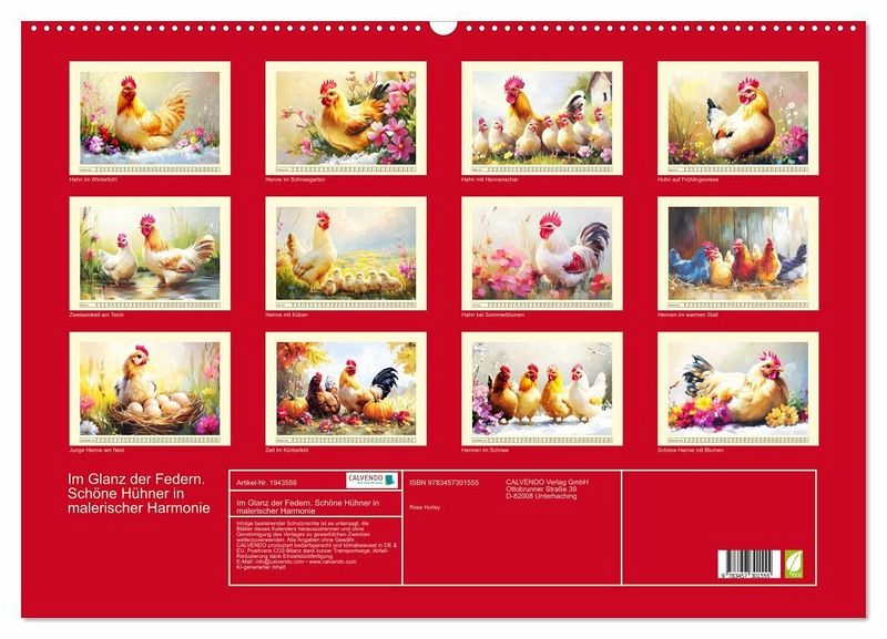 QUALITÄT - Hochwertiger Fotokalender mit 12 wunderschönen Motiven auf lichtbeständigem Bilderdruckpapier, robuste Spiralbindung mit Aufhängebügel.NACHHALTIG - deutliche Abfallreduzierung durch bedarfsgerechte Einzelstückfertigung, umweltfreundliches FSC-zertifiziertes Papier, Produktion in Deutschland, klimabewusste Logistik.PERFEKTES GESCHENK - Kalender für Freunde und Familie, für Kinder und Erwachsene, jung und alt, zu Weihnachten, Geburtstag oder zwischendurch.VIELFALT - Bildkalender in verschiedenen Formaten, z.B. DIN A5, DIN A4, DIN A3 sowie DIN A2. Ob Naturmotiv, Gemälde oder Fotos, ideal für ein persönliches Wohlfühlambiente.Stimmungsvolle Bilder von Hühnern und Hähnen - inmitten von Blumen, Schnee und Natur - im zeitlosen Stil der klassischen Ölmalerei von Autor(in): Rose Hurley