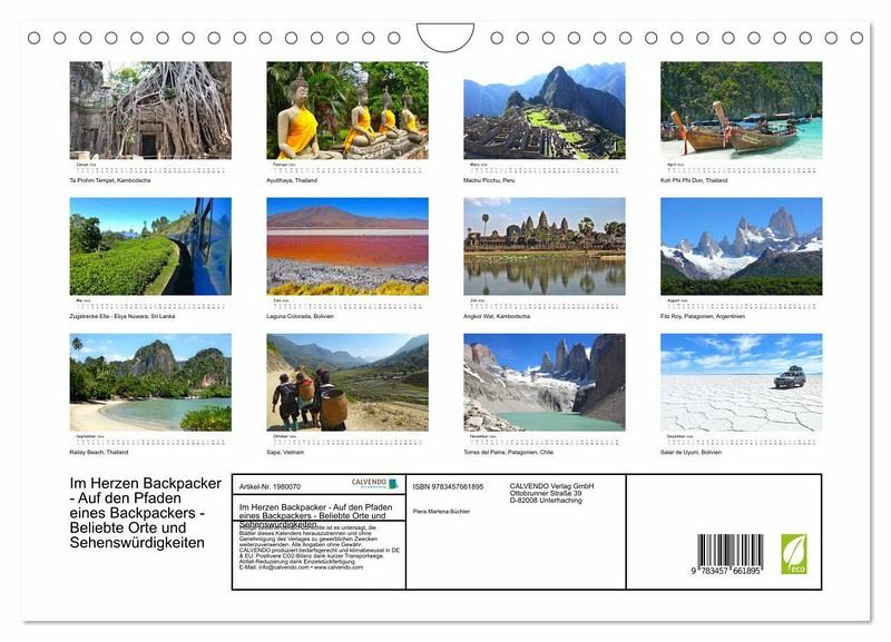 Der Kalender spricht die Sehnsucht nach Ferne an und lädt dazu ein von fernen Zielen zu träumen. Die Motive zeigen typische Länder, Orte und Sehenswürdigkeiten, die vor allem bei Backpackern begehrt sind. Von südostasiatischen Zielen wie Thailand, Vietnam, Kambodscha und Sri Lanka bis hin zu den Perlen Südamerikas Argentinien, Chile, Peru und Bolivien. Hier ist für jedes Backpacker Herz etwas dabei.