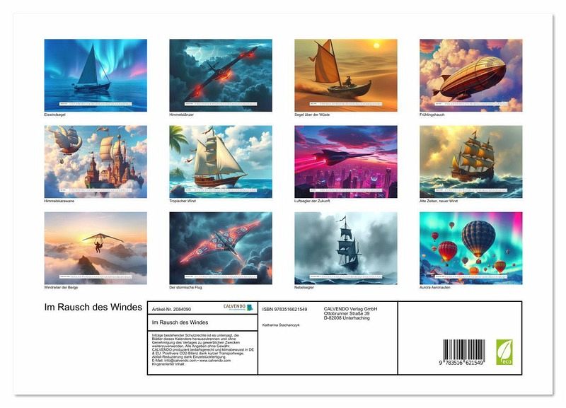 Im Rausch des Windes - Eleganz der luftigen Bewegung entführt Sie in eine poetische KI-Welt, in der Wind zur treibenden Kraft atemberaubender Reisen wird. Ob majestätische Segelschiffe auf stürmischer See, futuristische Luftfahrzeuge in schwebender Balance oder fantasievolle Windgleiter über endlosen Landschaften - jeder Monat dieses Kalenders ist eine Hommage an die Schönheit der Bewegung, an Freiheit, Technik und Träumerei. Lassen Sie sich ein Jahr lang beflügeln von der Magie des Windes - kraftvoll, leicht und grenzenlos inspirierend.
