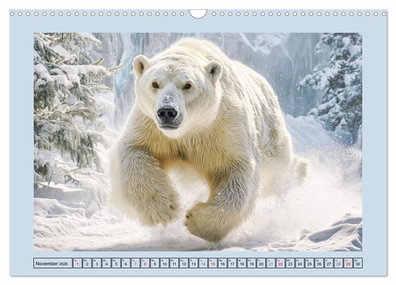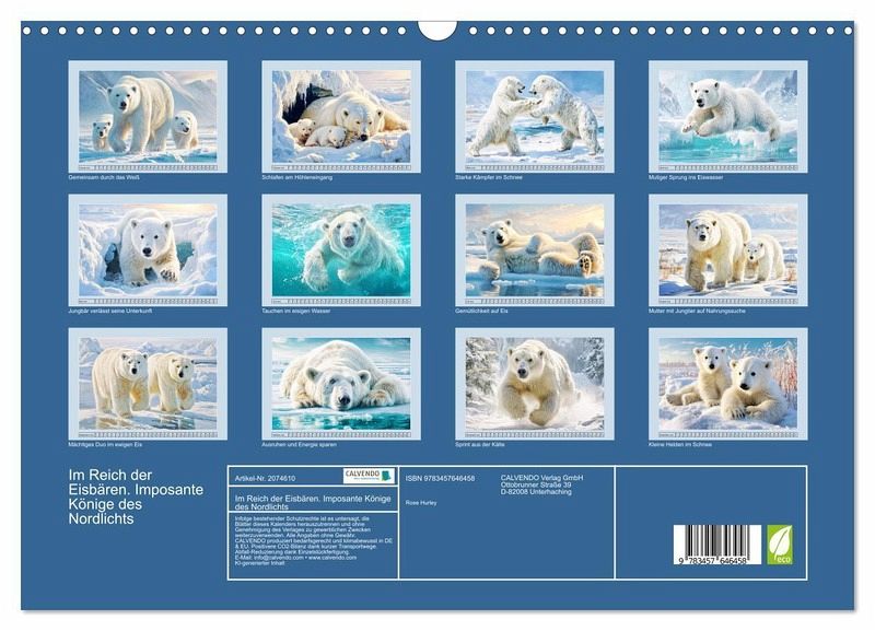 Dieser Kalender präsentiert eindrucksvolle Szenen aus dem rauen Leben der Eisbären. Sie sind die wahren Herrscher des ewigen Eises. Mit scharfen Sinnen und einer unerschütterlichen Ruhe durchqueren sie eine der lebensfeindlichsten Regionen der Erde. Ihre Welt ist geprägt von Kälte, Weite und Überlebenskunst und doch steckt in jedem Bild ein Hauch von Erhabenheit. Alle Bilder wurden mit der Hilfe von KI erstellt und bieten ein visuelles Erlebnis, das Respekt für die Natur und ihre wilden Bewohner weckt.
