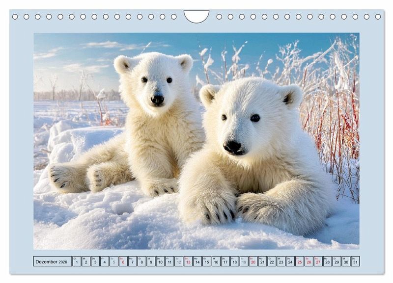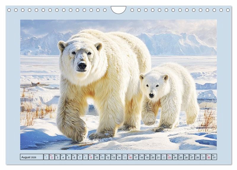 Dieser Kalender präsentiert eindrucksvolle Szenen aus dem rauen Leben der Eisbären. Sie sind die wahren Herrscher des ewigen Eises. Mit scharfen Sinnen und einer unerschütterlichen Ruhe durchqueren sie eine der lebensfeindlichsten Regionen der Erde. Ihre Welt ist geprägt von Kälte, Weite und Überlebenskunst und doch steckt in jedem Bild ein Hauch von Erhabenheit. Alle Bilder wurden mit der Hilfe von KI erstellt und bieten ein visuelles Erlebnis, das Respekt für die Natur und ihre wilden Bewohner weckt.