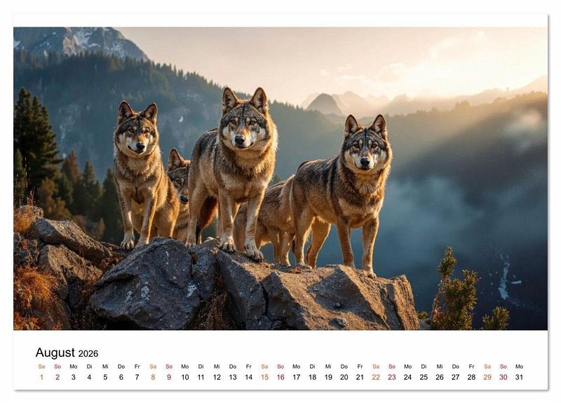 Treten Sie ein in die faszinierende Welt der Wölfe - kraftvoll, geheimnisvoll, voller Leben. Erleben Sie den Augenblick, wenn eines dieser majestätischen Tiere durch den tiefen Schnee hetzt, Schneeflocken aufwirbelt und die Wildnis mit Leben füllt. Spüren Sie die Spannung, wenn drei Wölfe mit gespitzten Ohren im Winterwald lauschen. Beobachten Sie zarte Momente, wenn eine Wölfin ihr Junges sanft liebkost. Oder schauen Sie mit klopfendem Herzen hinter einen Baumstamm, wo ein Wolf seine Beute erspäht. Jedes dieser ausdrucksstarken KI-generierten Bilder erzählt von Freiheit, Instinkt und tiefer Verbundenheit mit der Natur. Ein Kalender für alle, die die Schönheit der Natur mit offenen Augen und offenem Herzen sehen möchten.
