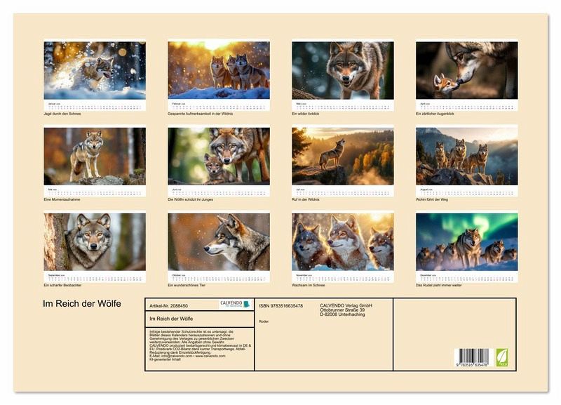 Treten Sie ein in die faszinierende Welt der Wölfe - kraftvoll, geheimnisvoll, voller Leben. Erleben Sie den Augenblick, wenn eines dieser majestätischen Tiere durch den tiefen Schnee hetzt, Schneeflocken aufwirbelt und die Wildnis mit Leben füllt. Spüren Sie die Spannung, wenn drei Wölfe mit gespitzten Ohren im Winterwald lauschen. Beobachten Sie zarte Momente, wenn eine Wölfin ihr Junges sanft liebkost. Oder schauen Sie mit klopfendem Herzen hinter einen Baumstamm, wo ein Wolf seine Beute erspäht. Jedes dieser ausdrucksstarken KI-generierten Bilder erzählt von Freiheit, Instinkt und tiefer Verbundenheit mit der Natur. Ein Kalender für alle, die die Schönheit der Natur mit offenen Augen und offenem Herzen sehen möchten.
