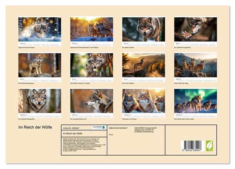 Treten Sie ein in die faszinierende Welt der Wölfe - kraftvoll, geheimnisvoll, voller Leben. Erleben Sie den Augenblick, wenn eines dieser majestätischen Tiere durch den tiefen Schnee hetzt, Schneeflocken aufwirbelt und die Wildnis mit Leben füllt. Spüren Sie die Spannung, wenn drei Wölfe mit gespitzten Ohren im Winterwald lauschen. Beobachten Sie zarte Momente, wenn eine Wölfin ihr Junges sanft liebkost. Oder schauen Sie mit klopfendem Herzen hinter einen Baumstamm, wo ein Wolf seine Beute erspäht. Jedes dieser ausdrucksstarken KI-generierten Bilder erzählt von Freiheit, Instinkt und tiefer Verbundenheit mit der Natur. Ein Kalender für alle, die die Schönheit der Natur mit offenen Augen und offenem Herzen sehen möchten.