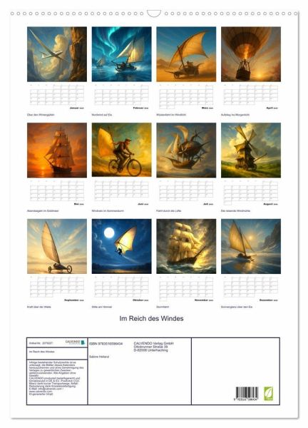 Windkraft schafft Bewegung - und Magie. Ob auf hoher See, über goldene Salzebenen oder durch verschneite Bergwelten - dieser Kalender zeigt in episch gestalteten und mit KI generierten Motiven, wie vielfältig und kraftvoll windgetriebene Fortbewegung sein kann. Vom Segelschiff bis zum Luftschlitten, vom Hanggleiter bis zur fahrenden Windmühle: Jedes Bild ist eine Hommage an die Eleganz der Naturkraft Wind - inszeniert in majestätischen Landschaften voller Licht, Dynamik und Poesie.