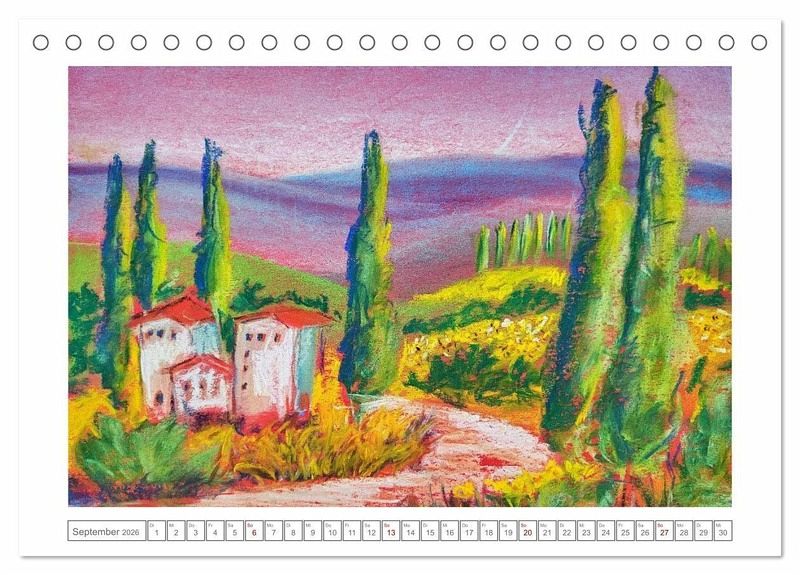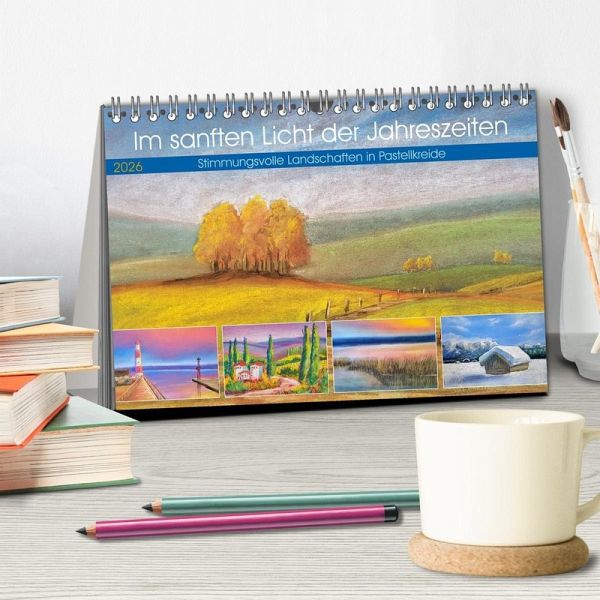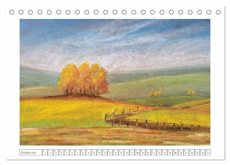 Tauche ein in die stimmungsvolle Welt sanft gemalter Landschaften. In zarten Farben und atmosphärischer Tiefe zeigt dieser Kalender zwölf Pastellkreidebilder, die den Zauber der Jahreszeiten einfangen. Ob frostige Winterlandschaften, blühender Frühling, goldener Herbst oder toskanischer Spätsommer, jedes Bild erzählt vom Wandel der Natur und lädt zum Verweilen ein.