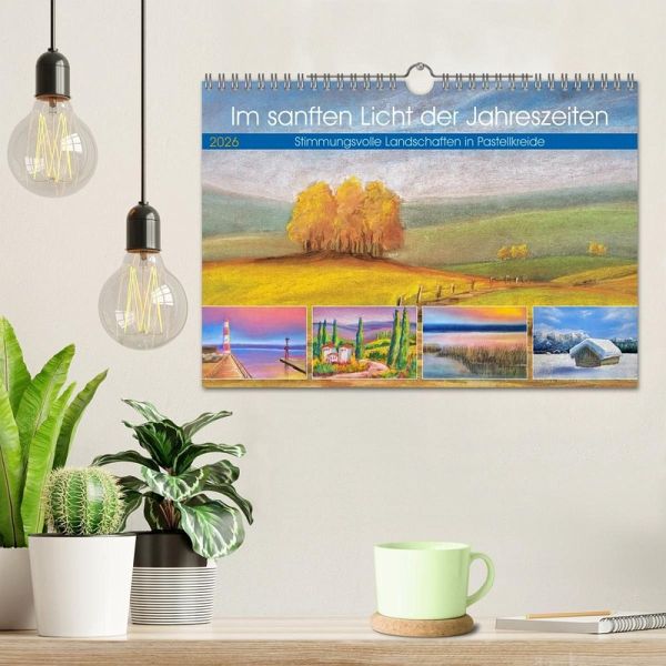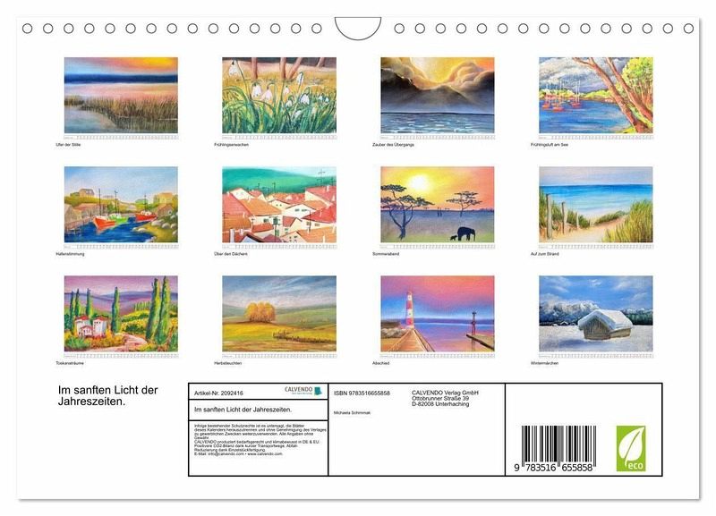 Tauche ein in die stimmungsvolle Welt sanft gemalter Landschaften. In zarten Farben und atmosphärischer Tiefe zeigt dieser Kalender zwölf Pastellkreidebilder, die den Zauber der Jahreszeiten einfangen. Ob frostige Winterlandschaften, blühender Frühling, goldener Herbst oder toskanischer Spätsommer, jedes Bild erzählt vom Wandel der Natur und lädt zum Verweilen ein.