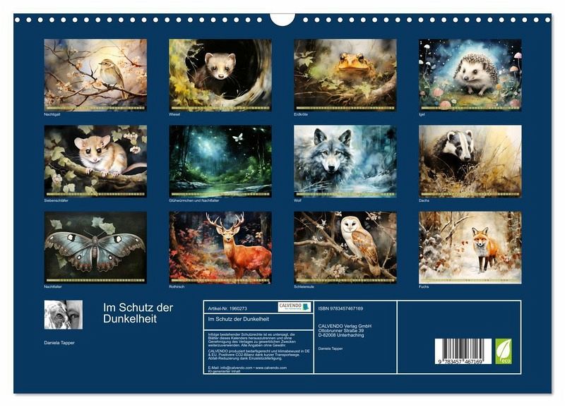 Möchten Sie einen Einblick in die verborgene Welt der nächtlichen Geschöpfe bekommen? Dieser Kalender zeigt Ihnen jeden Monat, Dank einer KI, eine bezaubernde Aquarellzeichnung eines nachtaktiven Tieres. Mit Aquarell können die feinen Details und Texturen dieser wunderbaren Tiere hervorgehoben, sowie die geheimnisvolle Stimmung und besondere Atmosphäre der Nacht exzellent einfangen werden.