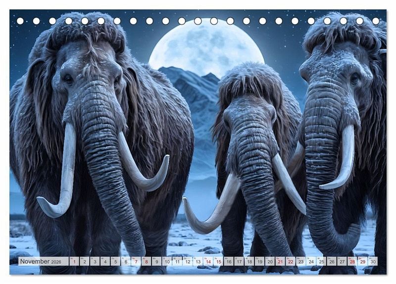 Die gewaltigen Mammute waren anpassungsfähige Tiere, die über Millionen von Jahren eine Vielzahl von Lebensräumen besiedelten und dann ausstarben. Das letzte Mammut lebte bis vor etwa 4000 Jahren. Der außergewöhnliche Mammut-Kalender von Renate Utz erweckt diese faszinierenden Lebewesen mithilfe von KI zu neuem Leben und entführt dich in eine längst vergangene Ära. Begib dich auf eine fesselnde Zeitreise in die Welt dieser urzeitlichen Giganten. Durchstreife die atemberaubenden Landschaften der Eiszeit, wo einst das Mammut die Erde beherrschte. Erlebe ein Abenteuer wie kein anderes und lasse dich von der Schönheit und Faszination dieser prähistorischen Welt verzaubern! Das ideale Geschenk für alle Naturliebhaber und Geschichtsinteressierten.