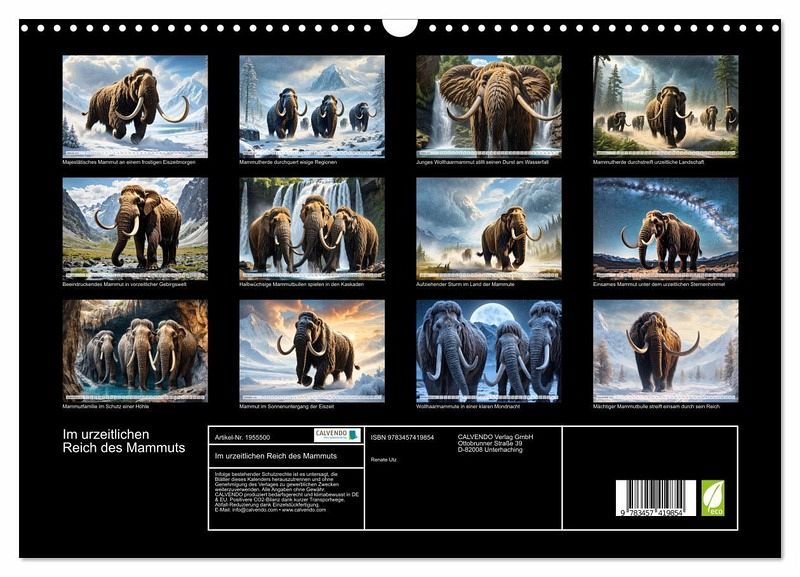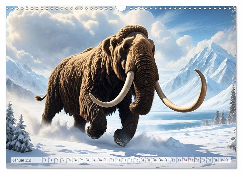 Die gewaltigen Mammute waren anpassungsfähige Tiere, die über Millionen von Jahren eine Vielzahl von Lebensräumen besiedelten und dann ausstarben. Das letzte Mammut lebte bis vor etwa 4000 Jahren. Der außergewöhnliche Mammut-Kalender von Renate Utz erweckt diese faszinierenden Lebewesen mithilfe von KI zu neuem Leben und entführt dich in eine längst vergangene Ära. Begib dich auf eine fesselnde Zeitreise in die Welt dieser urzeitlichen Giganten. Durchstreife die atemberaubenden Landschaften der Eiszeit, wo einst das Mammut die Erde beherrschte. Erlebe ein Abenteuer wie kein anderes und lasse dich von der Schönheit und Faszination dieser prähistorischen Welt verzaubern! Das ideale Geschenk für alle Naturliebhaber und Geschichtsinteressierten.