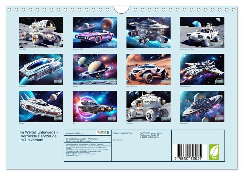 Tauchen Sie ein in die fantastischen Designs und innovativen Technologien, die in den unendlichen Weiten des Universums mithilfe der KI und der Fantasie existieren. Jeden Monat präsentieren wir Ihnen ein neues, atemberaubendes Fahrzeug, das Ihre Vorstellungskraft übersteigt. Sichern Sie sich jetzt diesen einzigartigen Kalender und lassen Sie sich von den verrückten Fahrzeugen im Universum begeistern!